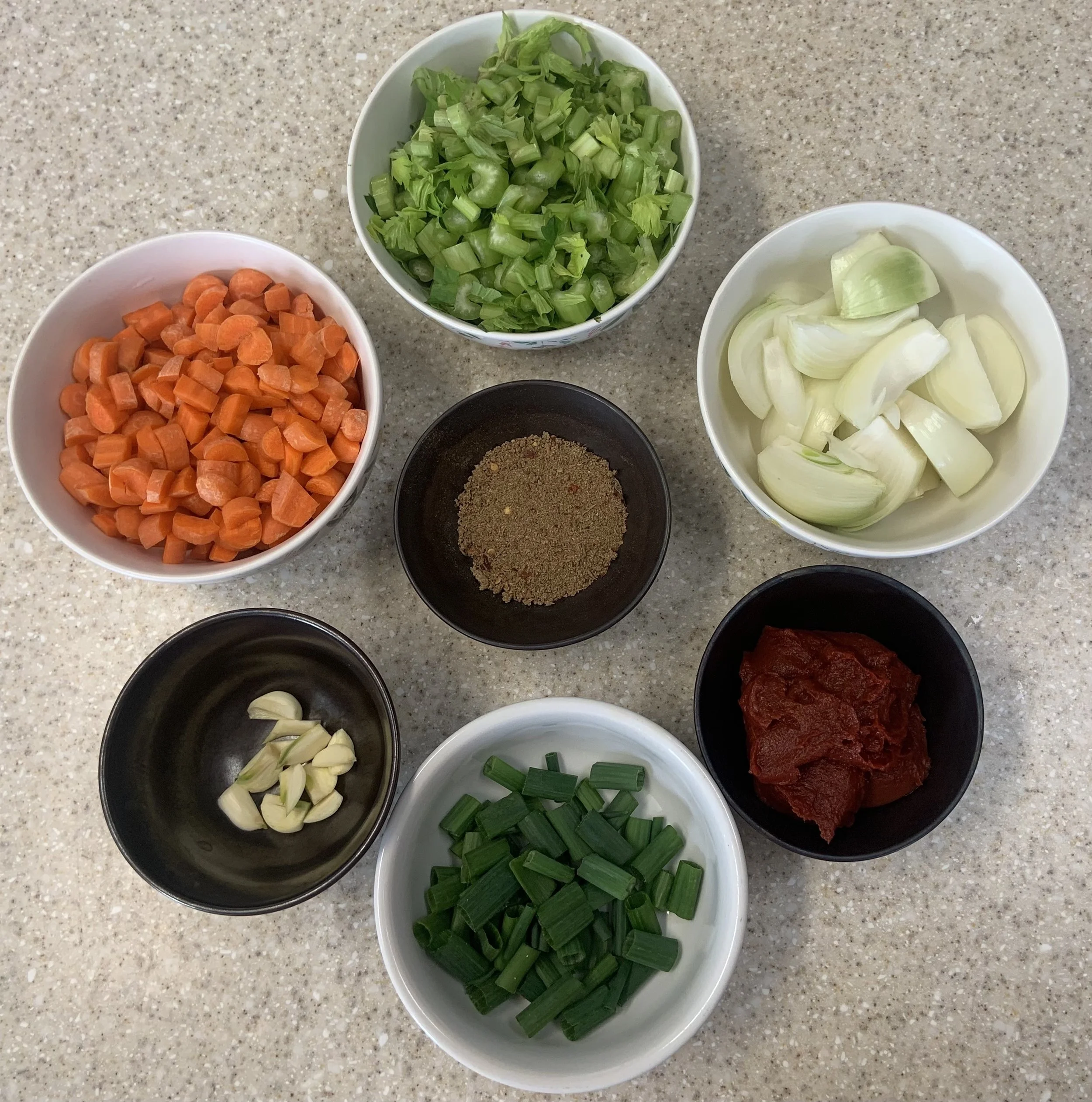 For my broth, I used the top of a bunch of organic celery (leaves and all), a leftover half bag of baby carrots, two onions, the green top part of a bunch of scallions, leftover cloves from a bulb of garlic, a small can of tomato paste and half of a jar of Umami mushroom seasoning from Trader Joe’s). The Umami seasoning has a kick due to the chili flakes, if you don’t like spicy, cut back on the amount.
